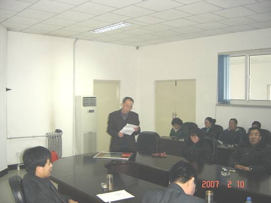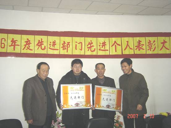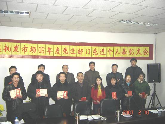 今天上午10:30,京西果菜批发市场2006年度先进部门及个人表彰大会顺利召开。出席会议的分别有:总经理王启兵,副总经理赵文斌、孙海涛、董清龙,总经理助理成春雨,办公室主任常树旭及全体员工。大会由副总经理赵文斌主持,办公室主任常树旭宣读了“2006年度先进部门及个人表彰决定”,并为先进部门及个人颁发了荣誉奖状及个人荣誉证书,先进部门及个人代表先后发言,最后总经理王启兵做了大会总结发言,大会最终圆满结束。