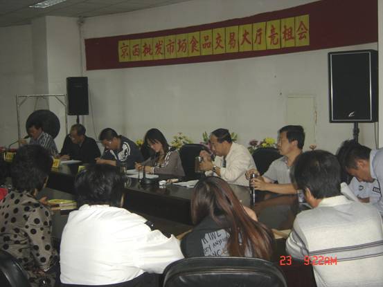 怀来县京西果菜批发市场副食品交易大厅公开竞租大会于2008年9月22、23日上午9点30两日在市场五楼会议室顺利召开,出席会议的领导分别有市场总经理刘万利、副经理赵文斌、孙海涛、董清龙,出席会议的还有办公室主任张海红、财务部主管赵文德、基建部主管常树旭及管理部工作人员和副食品大厅所有商户。22日上午竞租面食、豆制品区,共47个柜台;23日上午竞租熟食、小菜区,共35个柜台,四区共82个柜台,出租率为90%。
