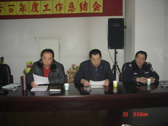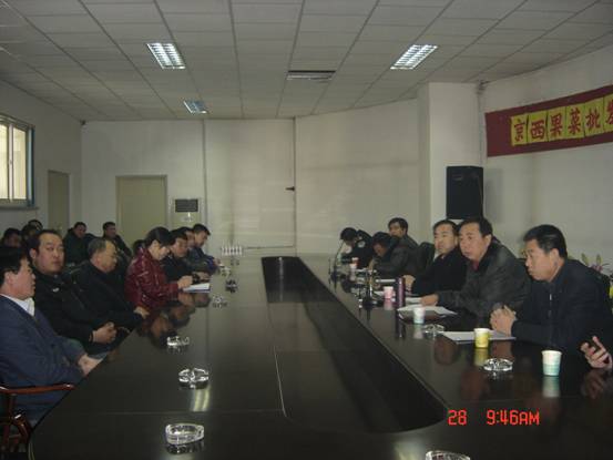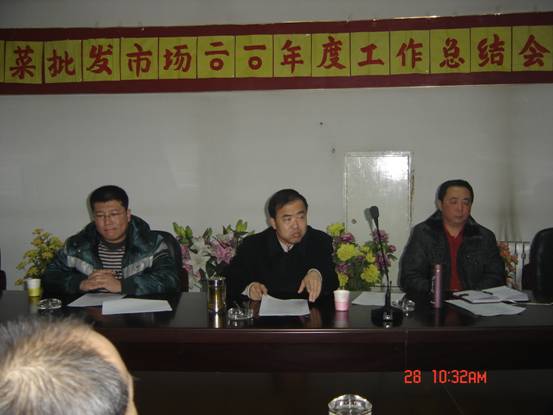 1月28日上午9时50分,怀来县京西果菜批发市场有限责任公司召开2010年终工作总结大会,参加会议的领导分别有:董事长孙贵权,董事张玉辉,总经理任永斌,副经理赵玉全、孙海涛、董清龙,总经理助理成春雨,市场派出所所长郝连成,办公室主任侯宏;其他参会成员还有市场各部门主管及普通职工。首先由副经理赵玉全宣读了市场新规定的,从2011年元月开始执行的“京西果菜批发市场职工考勤制度”;其次由总经理任永斌对2010全年工作做详细总结汇报;然后由董事长孙贵权发言;最后由总经理任永斌做补充发言。最终会议顺利召开。