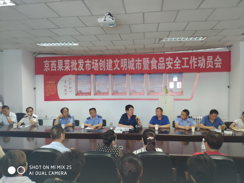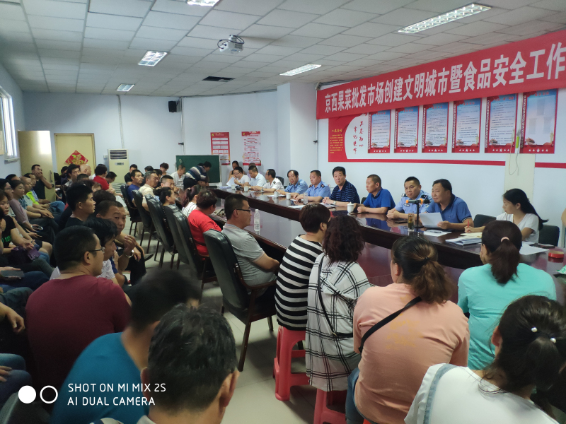 2019年6月13日下午3:00,怀来县京西果菜批发市场有限责任公司组织召开:“怀来县京西果菜批发市场创建文明城市暨食品安全工作动员会”,参会上级部门领导分别有:怀来县应急管理局程道升副局长;怀来县市场监督管理局池水平局长、董进泉副局长、李立东所长、张楠;怀来县行政审批局武胜忠科长、怀来县公安局市场派出所陈胜利所长。参会商户约150户。会议议程主要有两项:第一、由公司董事长刘长晴同志作京西果菜批发市场2019年度创建文明城市工作情况介绍。第二、由上级各部门领导做重要指示讲话。会上怀来县京西果菜批发市场董事长刘长晴同志宣读了中共怀来县委、政府办公室关于印发《怀来县创建省级文明城市宣传教育方案》的通知,怀来办文[2019]23号文件精神及怀来县集贸市场创城环境整治专项工作实地测评工作台帐。创文明城市要求怀来县市民要做到垃圾不落地、文明养犬、文明交通、争做文明门店、文明宣传,明确责任和目标,严抓工作落实。怀来县应急管理局领导程道升同志就目前安全生产工作现状及经营户经营过程中应注意的安全生产事项,倡导经营户主做好门店自查,安全隐患及时发现,及时整改、排除,杜绝一切安全隐患存在,要平安快乐经营,生活。怀来县市场和食品监督管理局领导:池水平、董进泉、李立东三位领导同志分别从经营户应严格做到证照齐全,亮证经营、规范经营;经营过程中禁销过期及山寨产品,进销货时要索票索证;要正确认识抽检,加强学习,以法经营,诚实经营。怀来县行政审批局武胜忠同志对协助市场及商户办理《小作坊登记证》应注意事项进行了明确说明。怀来县公安局市场派出所陈胜利同志希望市场商户应做到合法经营,依法经营;如遇治安事件及欺行霸市、强买强卖现象要做到及时报警、检举,公安局市场派出所将全力支持市场工作,维护公平公正交易环境。